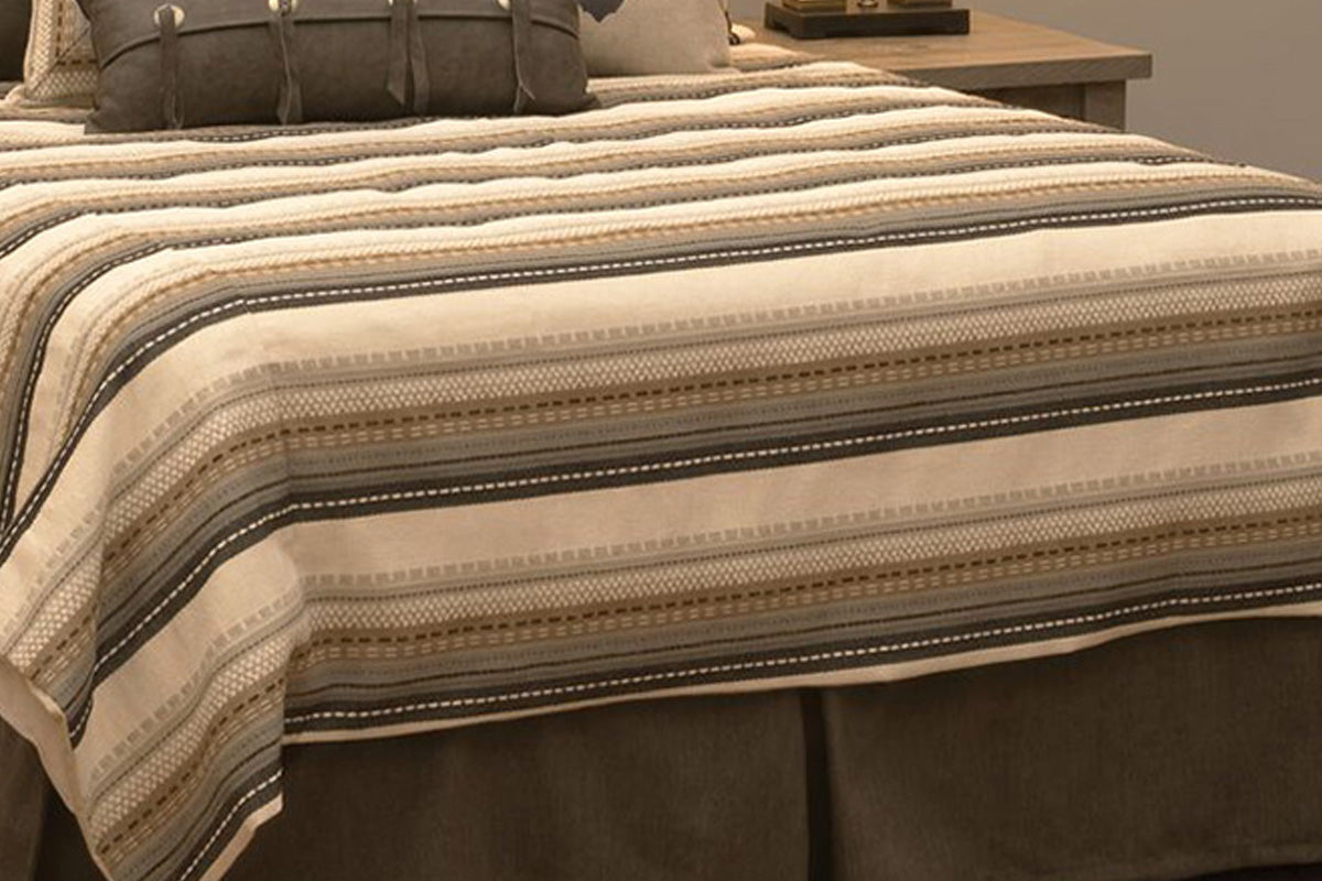 The Adobe Quarry bedding collection highlights a gray and cream hounds tooth pattern and is a combination of muted grays, browns, and taupe with a touch of black that creates tonal balance in this ensemble. We recommend accenting the Adobe Quarry ensemble with these coordinating options: Our hi-low texture Onyx Marbled Fox faux fur, our Natural Linen Image pillow (shown in the deer head silhouette with other images available), and our incredibly supple Saloon Gray leather concho bolster pillow.